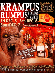 SHOP: Local artisans will be on hand to help with your holiday gift shopping. Among the arts and crafts youll find more than a few Krampus-themed items, including books, horned headdresses, and KRAMPUS LOS ANGELES shirts. DRINK: Sample Benny Boys European-inspired California-inflected brews in the tank bar or visit the cider house for some unique offerings, including steaming mulled cider. EAT: Pop-ups from favorite local kitchens will be selling BBQ, tamales, and tacos throughout the event. COSTUME: It's not required, but weve noticed that Krampus fans tend to show up in festive outfits reflecting their inner Bavarian party animal. PRIZES for outstanding costumes during the show
